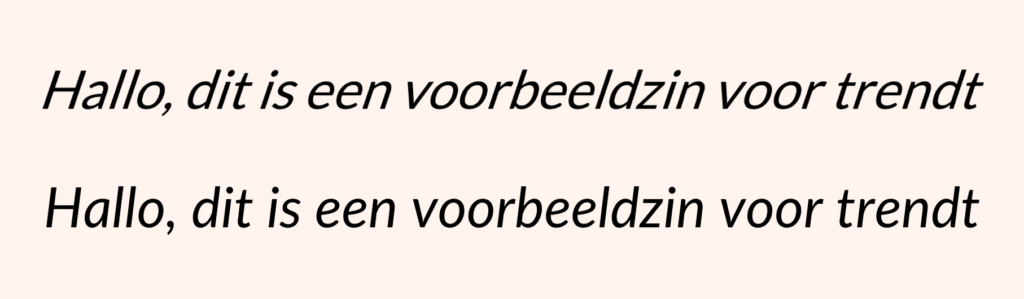 Deze zinnen zijn allebei geschreven in het lettertype Lato. Bij de bovenste zin is de tekst enkel schuingedrukt. Bij de onderste zin heb ik de schuine variant van Lato gebruikt. Je ziet dat de onderste zin een minder steile hellingsgraad heeft, sommige letters hebben een sierlijke afwerking (bijvoorbeeld de d en de e) en de a wordt zelfs helemaal anders geschreven.