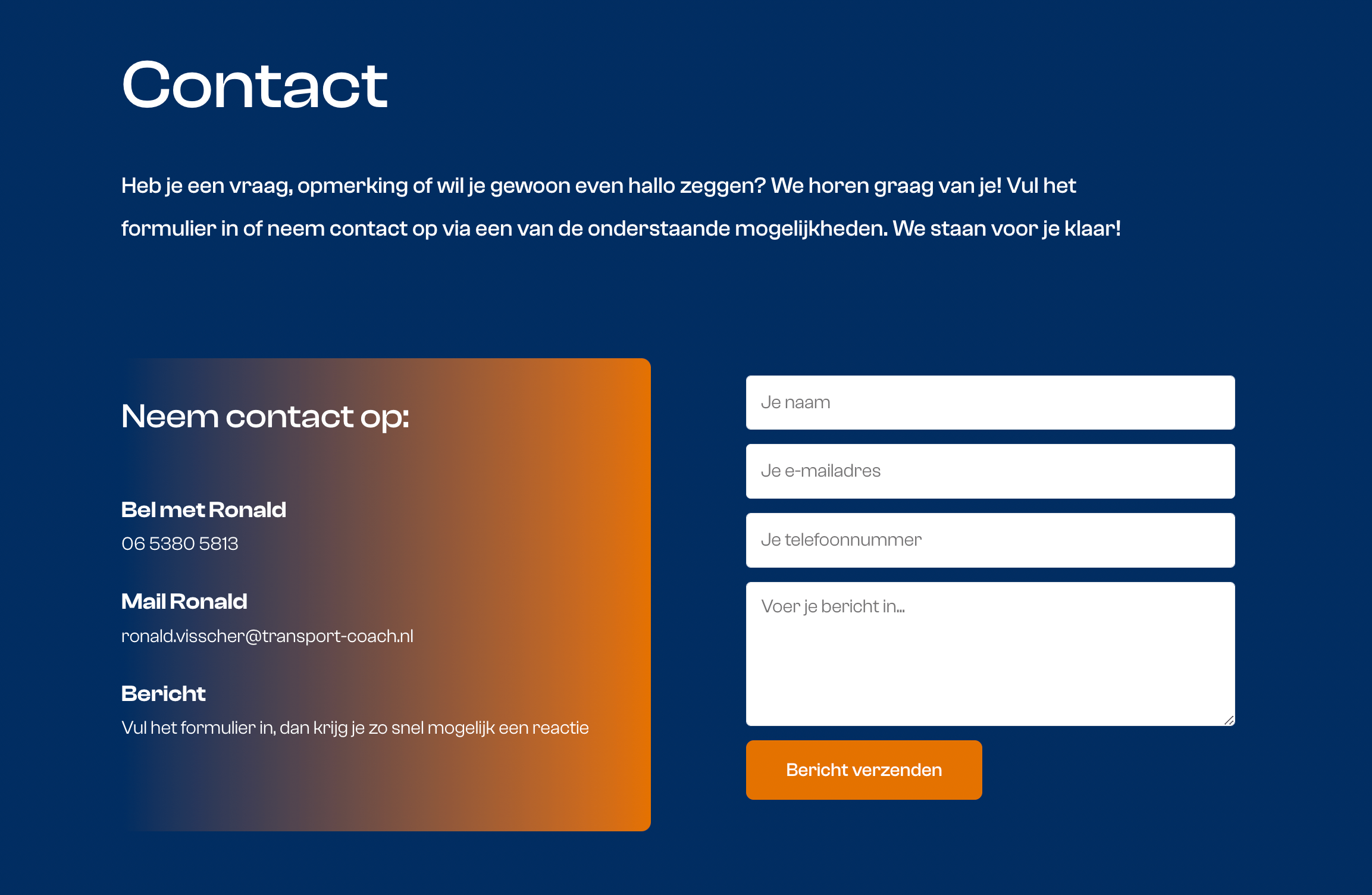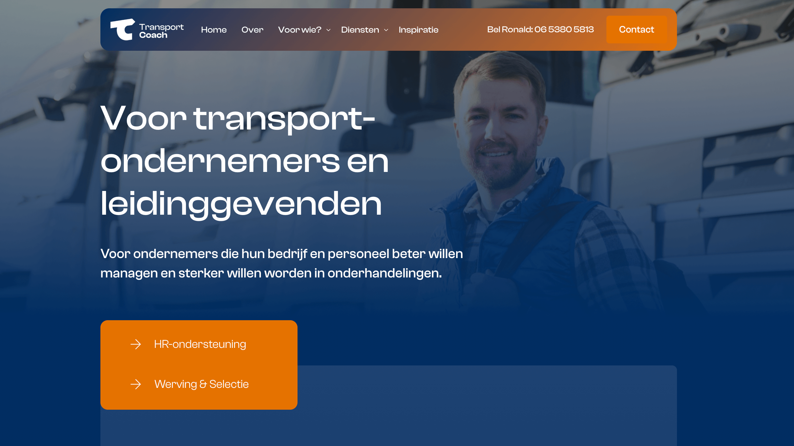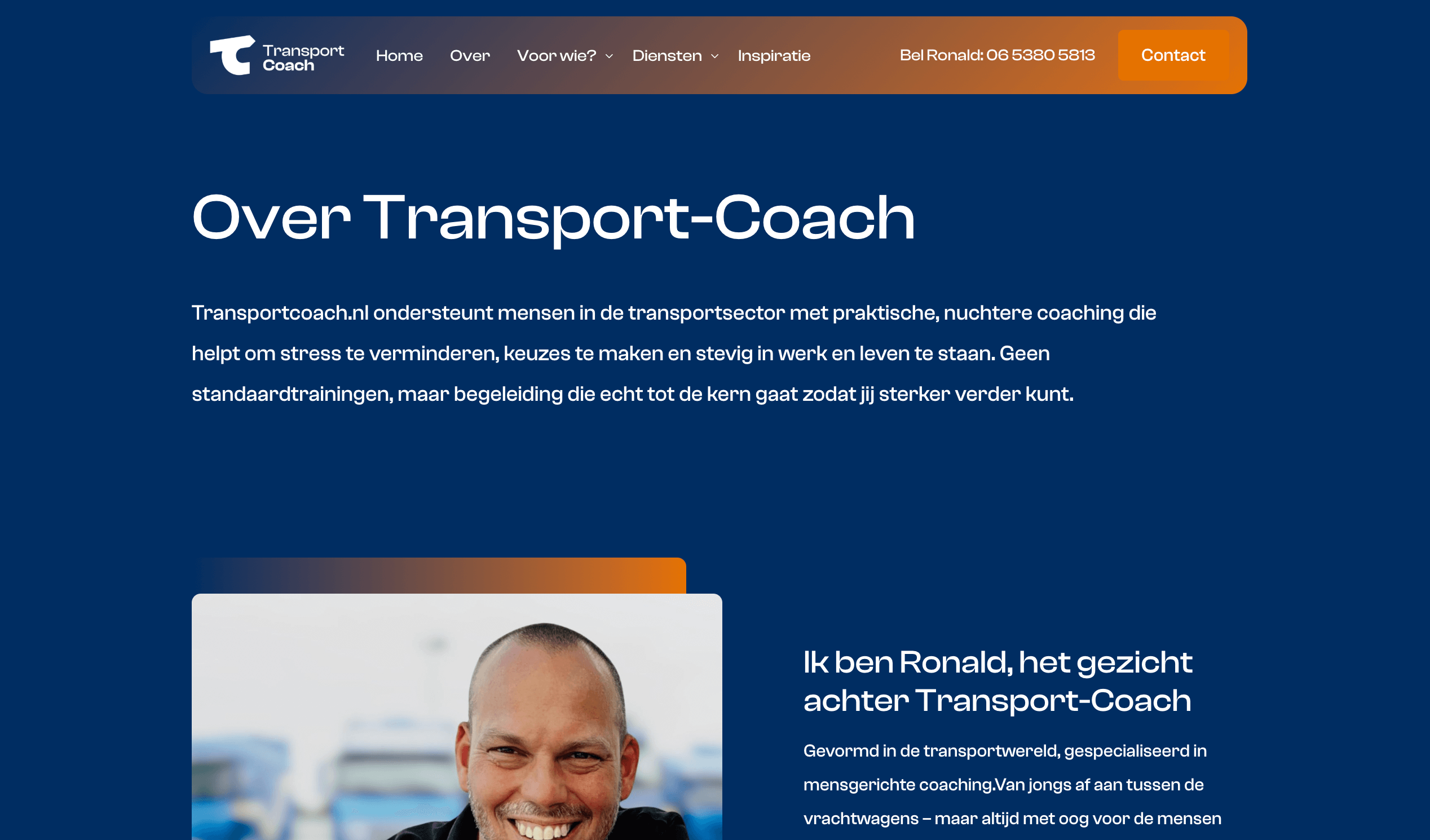 Transport-Coach richt zich volledig op mensen in de transportsector. Denk aan vrachtwagenchauffeurs, planners en ondernemers. Mensen die niet op zoek zijn naar poespas maar naar duidelijkheid, rust en een nuchtere aanpak. Voor Transport-Coach mocht ik het complete visuele fundament neerzetten: van logo en huisstijl tot een op maat gemaakte website. Het logo is stevig en herkenbaar. De website volgt diezelfde lijn: overzichtelijk, functioneel en vooral uitnodigend om contact op te nemen. Dit project was er een waarbij alles mooi samenkwam: doelgroep, visie en design. En dat merk je aan het resultaat! Helder, menselijk én met beide benen op de grond (en twee handen aan het stuur).